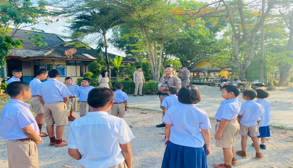 โครงการครู 5 นาที ร.ต.อ.ศิริพงศ์ ศิริเรศ รอง สวป.ฯ,ร.ต.ต.สุนทร เรืองศรี รอง สว.(จร.)ฯด.ต.นรินทร์ สมพงษ์พร้อมชุด ชมส.สภ.ระโนด ว.4 อบรม บรรยายให้ความรู้ แก่เด็กนักเรียน ของ โรงเรียนวัดศาลากลวงล่าง ม.6 ต.ท่าบอน อ.ระโนด จ.สงขลา บริเวณ หน้าเสาธงโรงเรียนวัดศาลากลวงล่าง ต.ท่าบอน อ.ระโนด จ.สงขลา