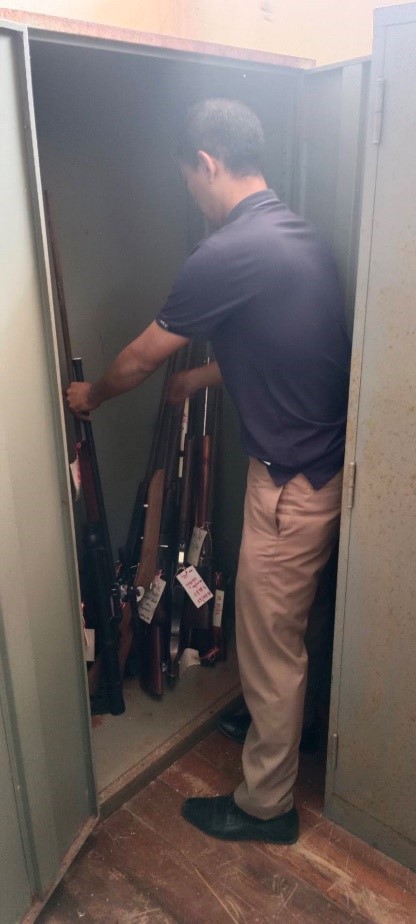 พนักงานเจ้าหน้าที่คดี ได้ร่วมตรวจสอบอาวุธปืนของกลางที่มีอยู่ในห้องเก็บของกลาง