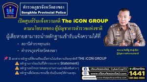 ตำรวจภูธรจังหวัดสงขลา ได้จัดตั้งศูนย์รับแจ้งความร้องทุกข์ คดี The Icon Group