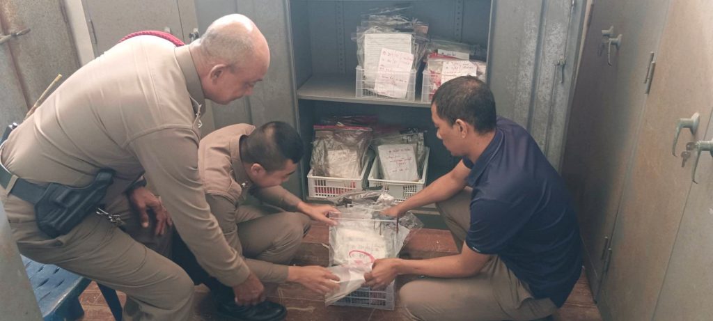 พนักงานเจ้าหน้าที่คดี ได้ร่วมตรวจสอบอาวุธปืนของกลางที่มีอยู่ในห้องเก็บของกลาง