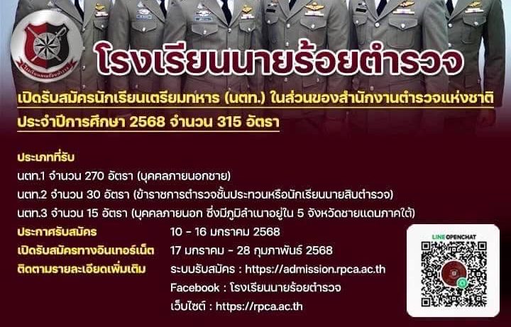 ข่าวประชาสัมพันธ์โรงเรียนนายร้อยตำรวจ เปิดรับสมัครนักเรียนเตรียมทหาร (นตท.) ในส่วนของสำนักงานตำรวจแห่งชาติ ประจำปีการศึกษา 2568 adminranot / 20 มกราคม 2025 ประกาศรับสมัคร โรงเร